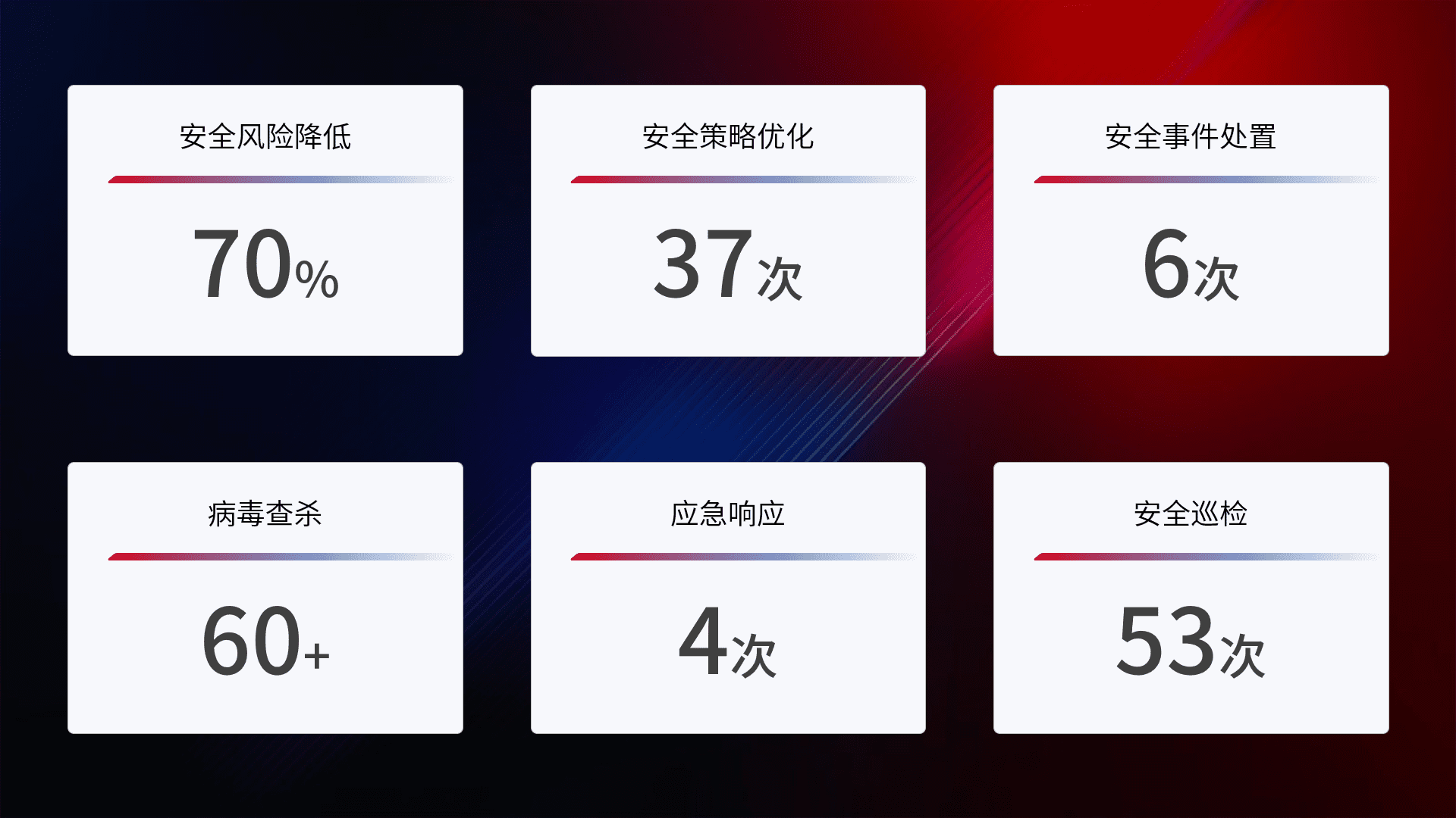 提供全面的安全事件报告体系,,,包括处置报告、、、周报、、季度和年度总结,,结合持续监控,,,帮助客户深入了解网络安全状况。。。。