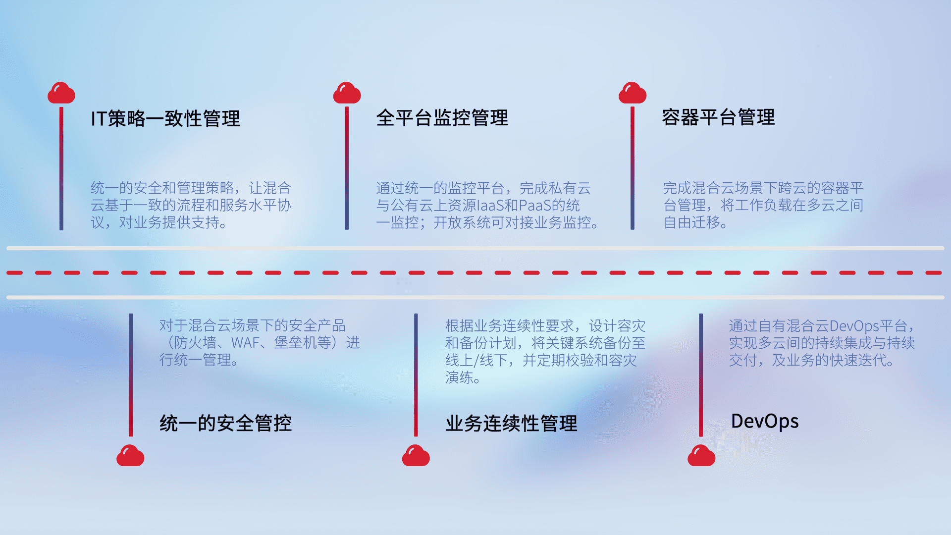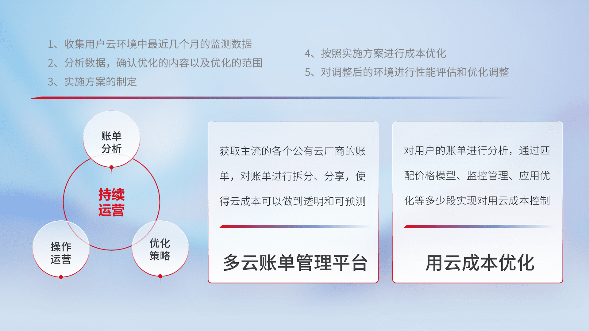 通过多云纳管,,,以统一的资源数据模型把客户的云资源进行抽象和封装,,,进而实现对多云资源的统一操作,,,,保障云资源管理的可靠性、、稳定性与可用性。。。。量身定制化运维内容,,配置、、开发运维、、、、补丁管理、、备份、、、监控、、、认证和访问管理、、审计和日常巡检等,,,保障在用云过程中的可靠度,,,稳定度以及高可用率。。。。