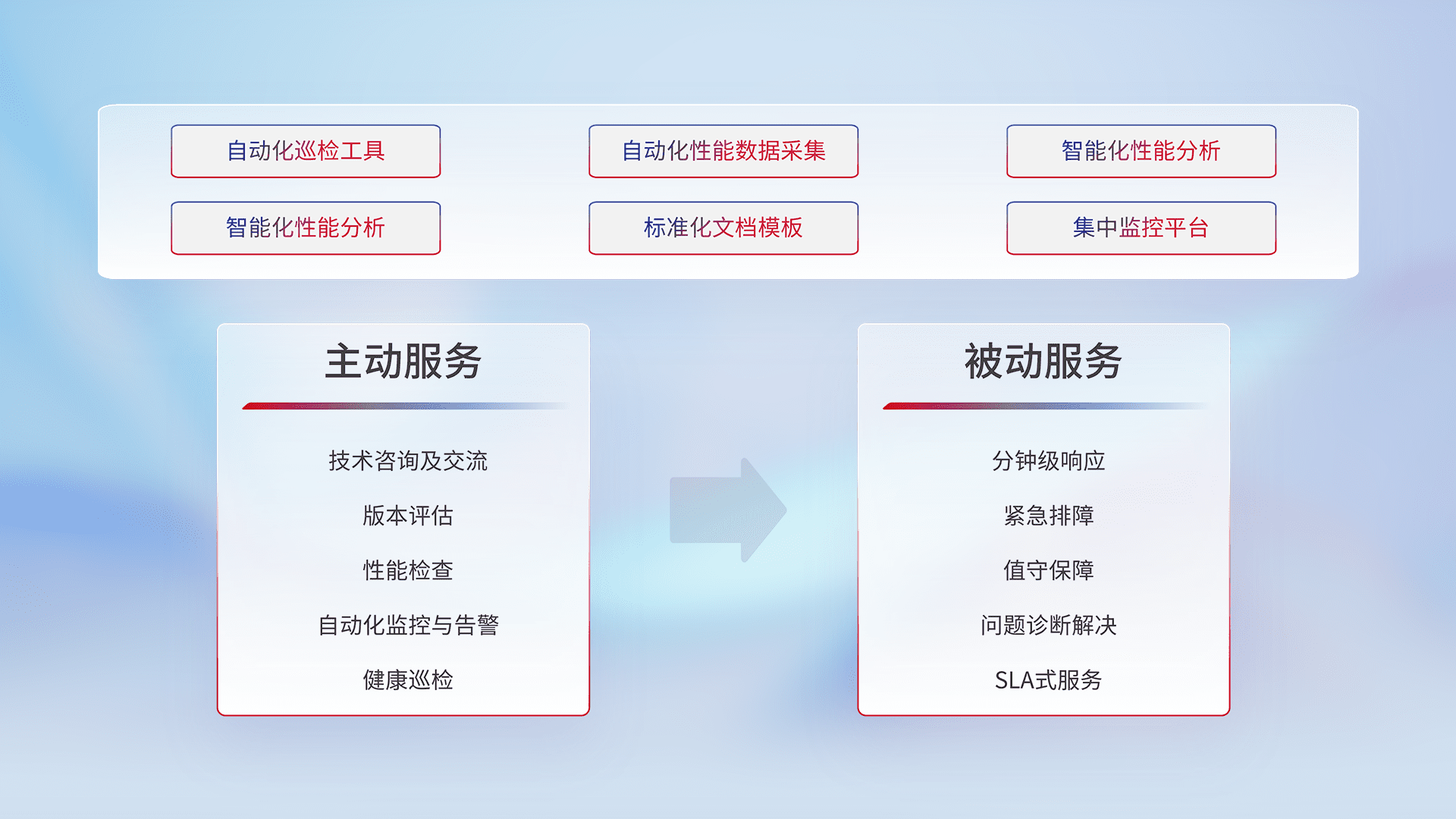 智能化工具和标准化文档,,,保障服务质量,,提供主动服务(包含技术咨询、、版本评估、、、性能检查、、、、自动化监控与告警、、、健康巡检)和被动服务包含(分钟级响应、、、、紧急排障、、、、值守保障、、、问题诊断解决、、、、SLA服务)。。